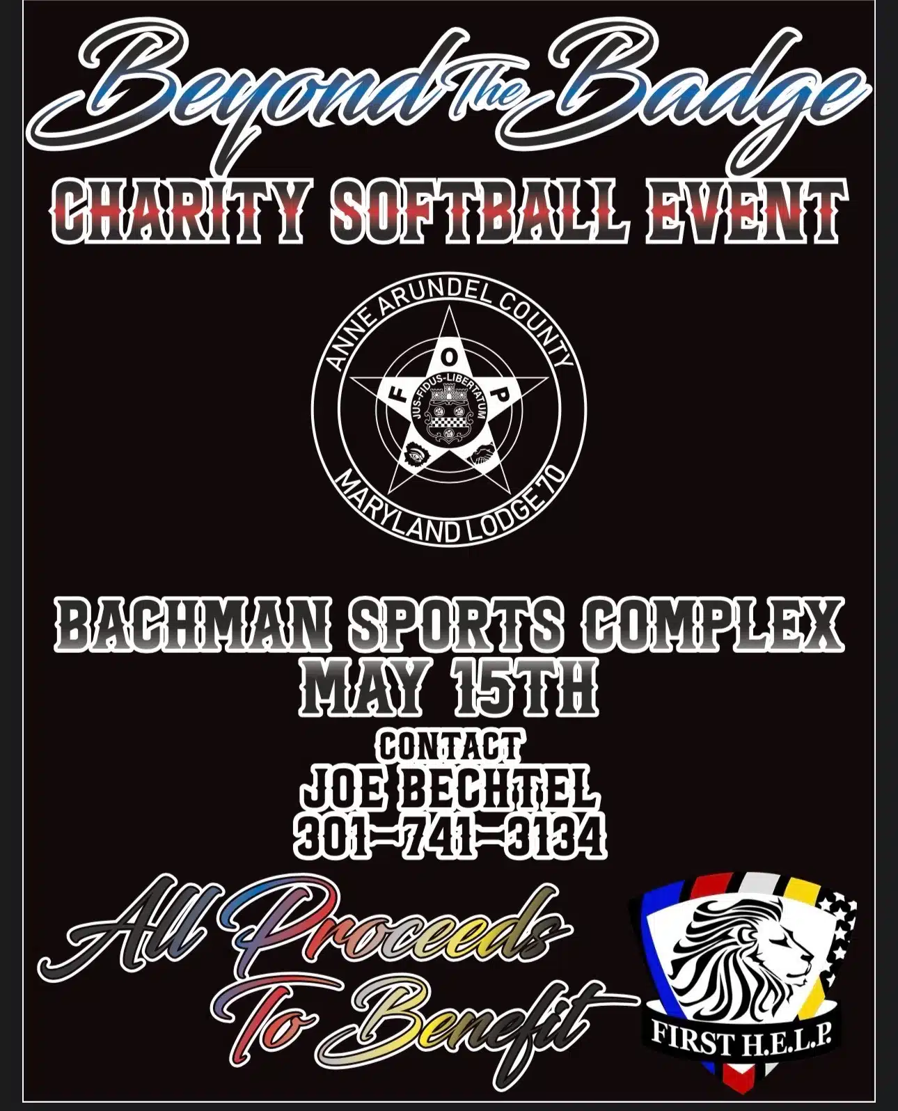 Beyond the Badge – Charity Softball Event May 15 Bachman Sports Complex 570 E Ordnance Rd, Glen Burnie, MD, United States Beyond the Badge - Charity Softball Event Contact Joe Bechtel with any questions! 301-741-3134