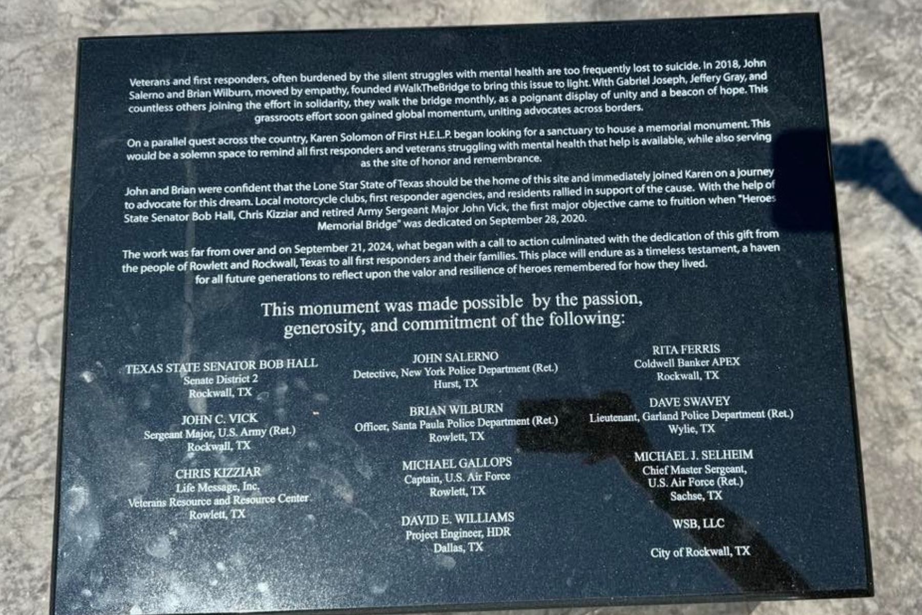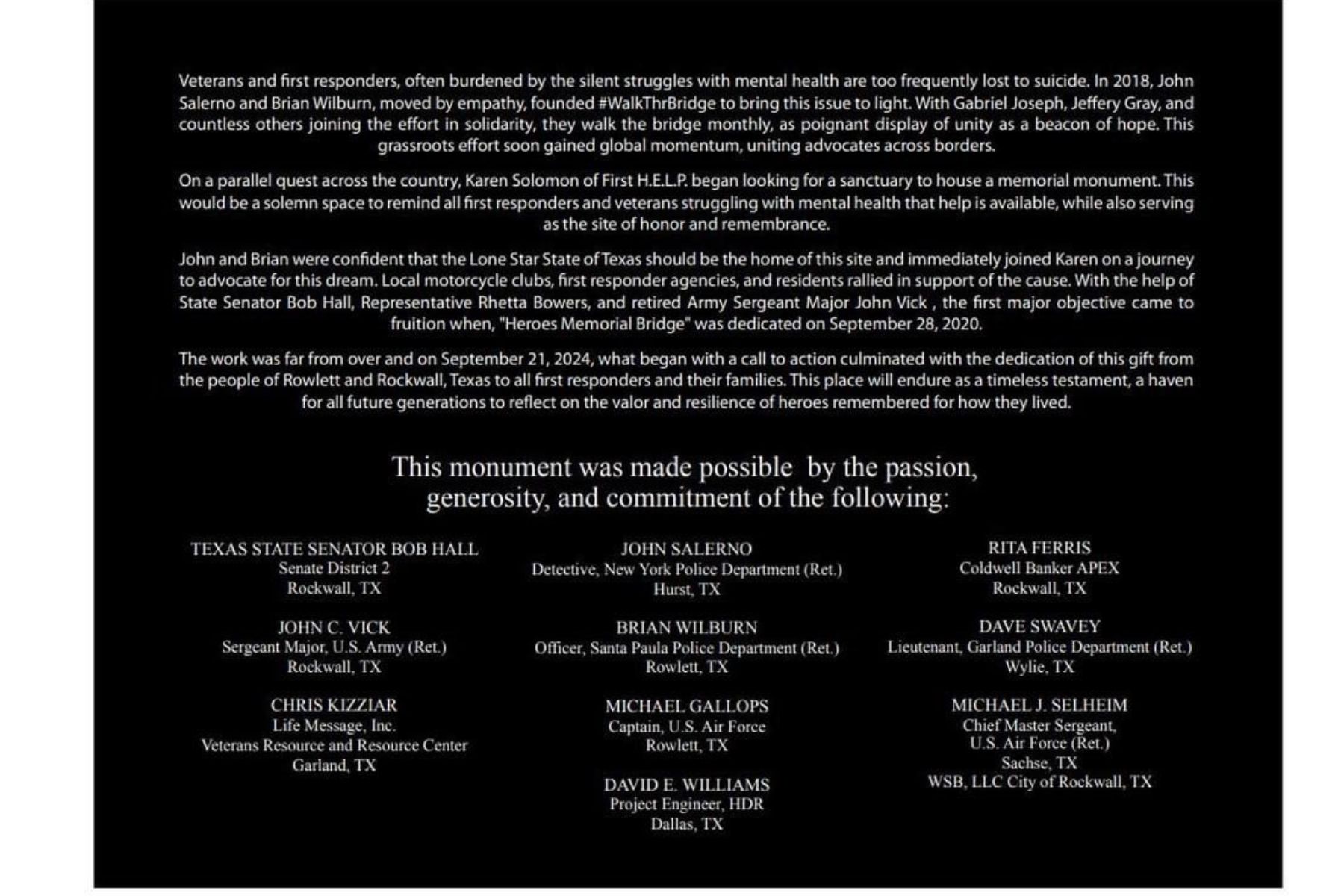 The work was far from over and on September 21, 2024, what began with a call to action culminated with the dedication of this gift from the people of Rowlett and Rockwall, Texas to all first responders and their families. This place will endure as a timeless testament, a haven for all future generations to reflect on the valor and resilience of heroes remembered for how they lived.