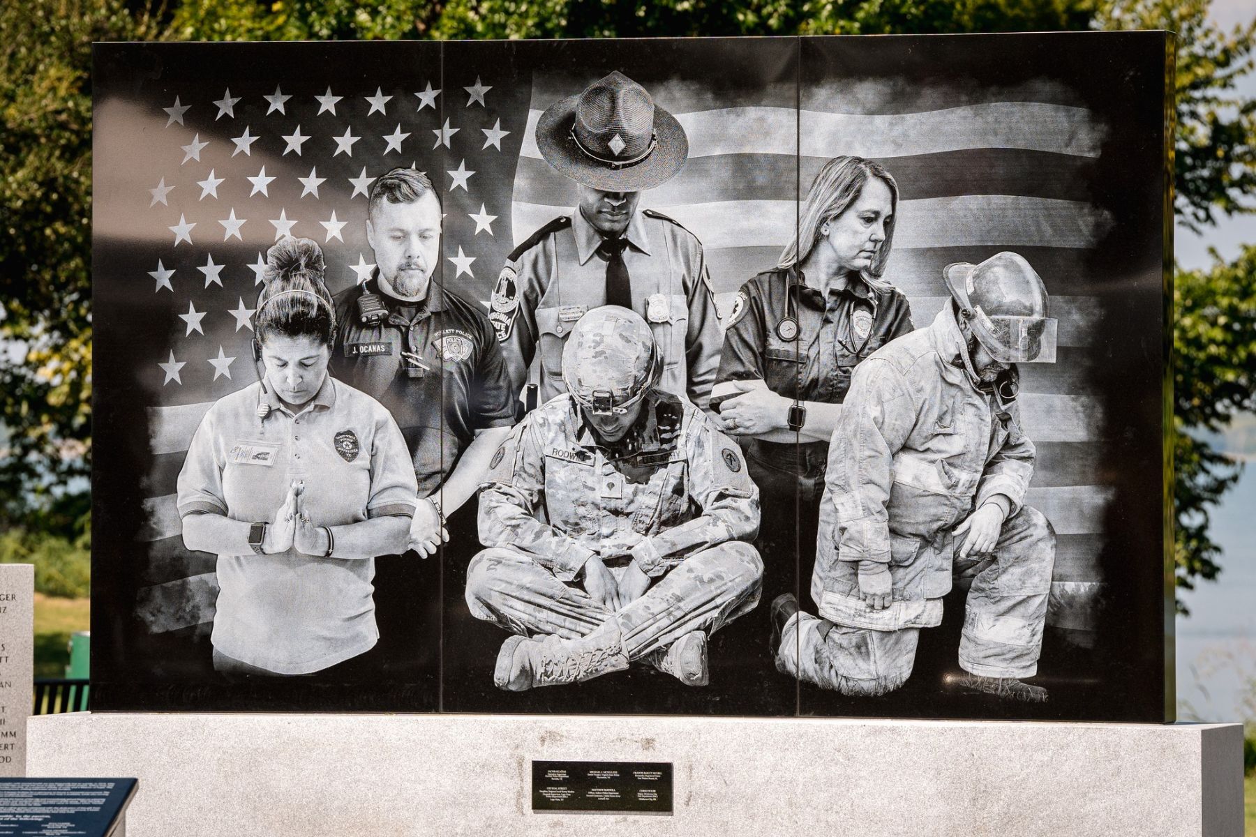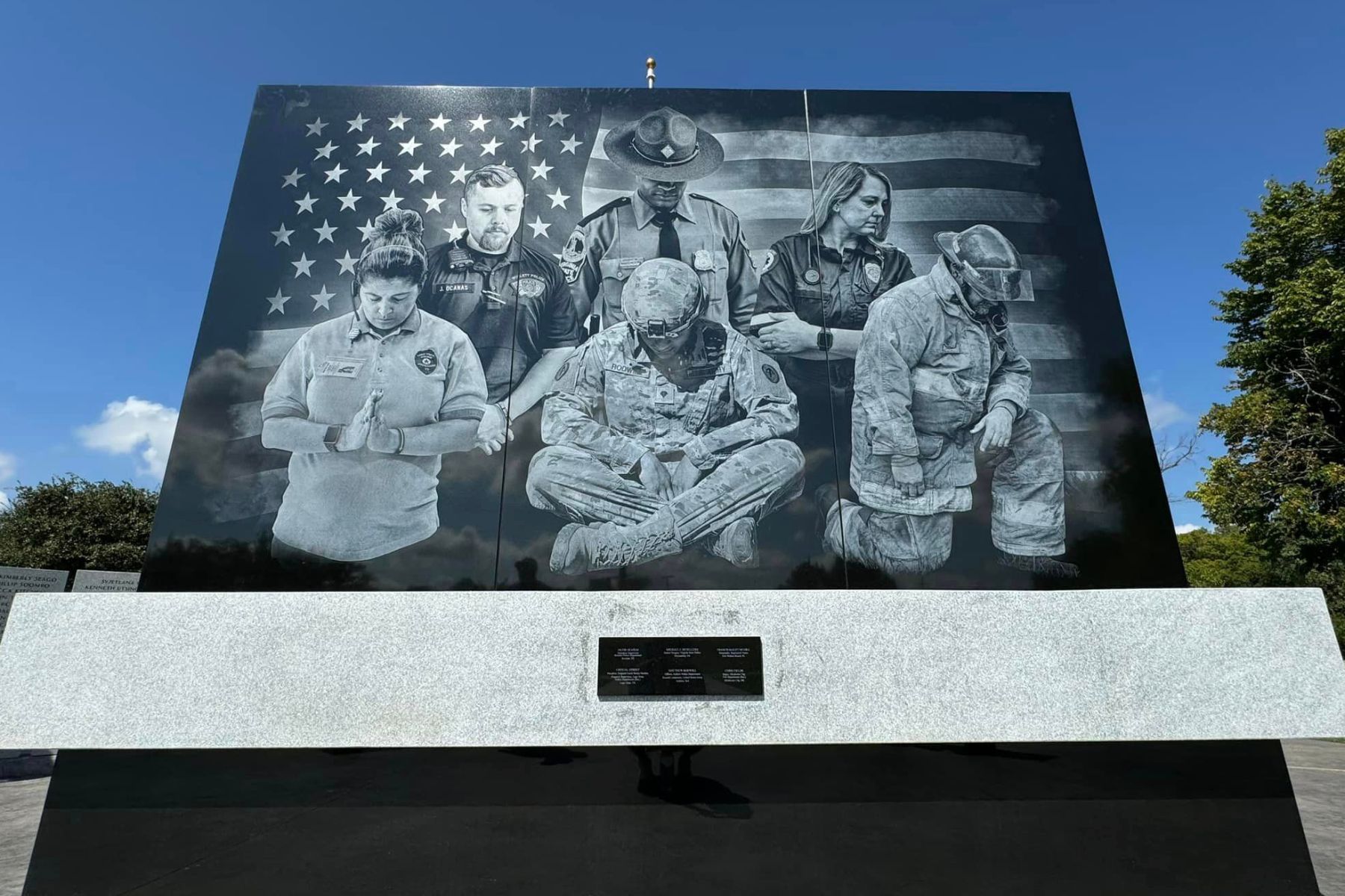 The main monument was unveiled on September 21, 2024 — an imposing structure weighing 23,000 pounds and standing 8 feet high, 12.5 feet long, and 2 feet wide. Etched on its front are six figures, each representing veterans and the first responder professions.