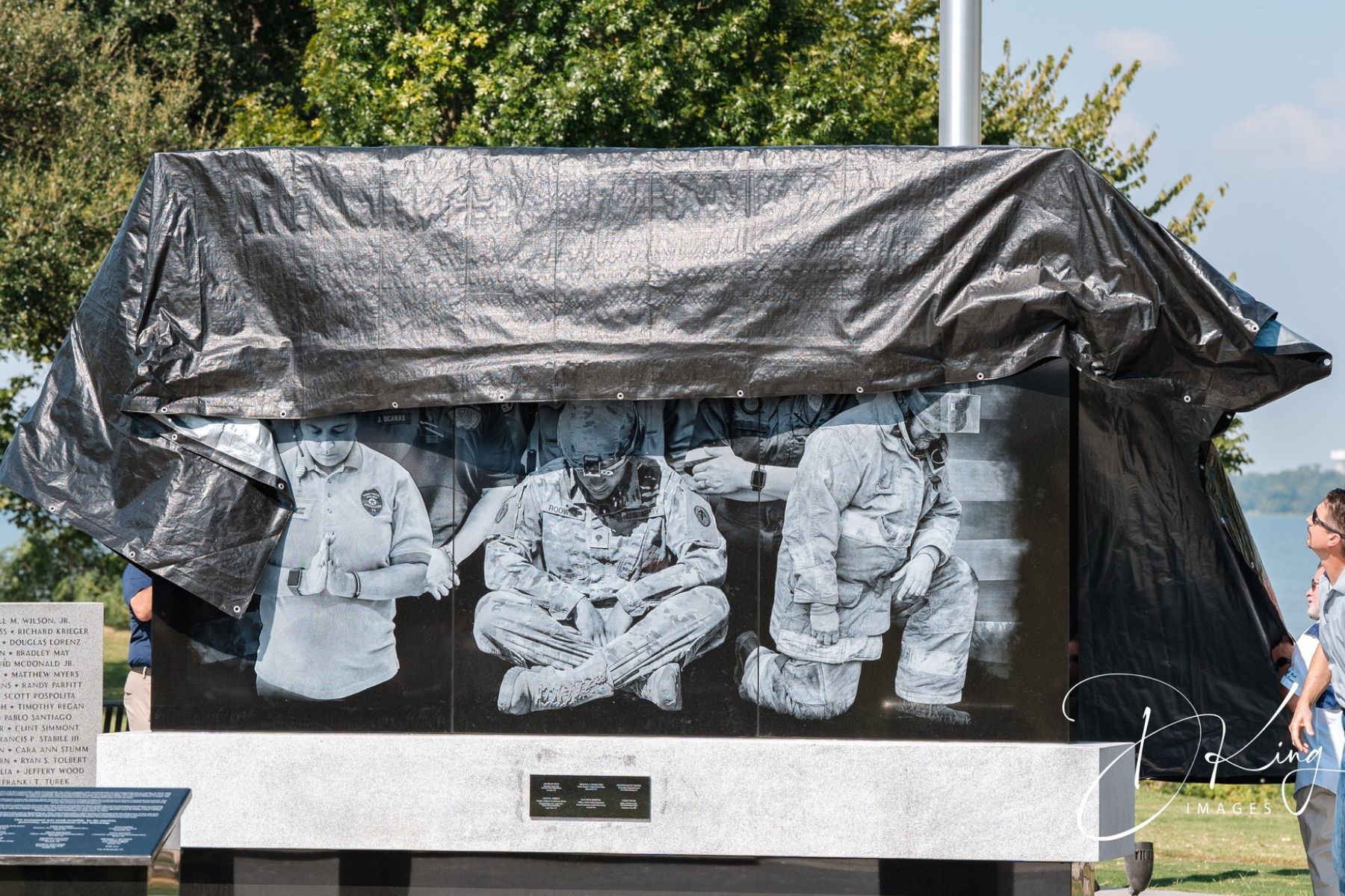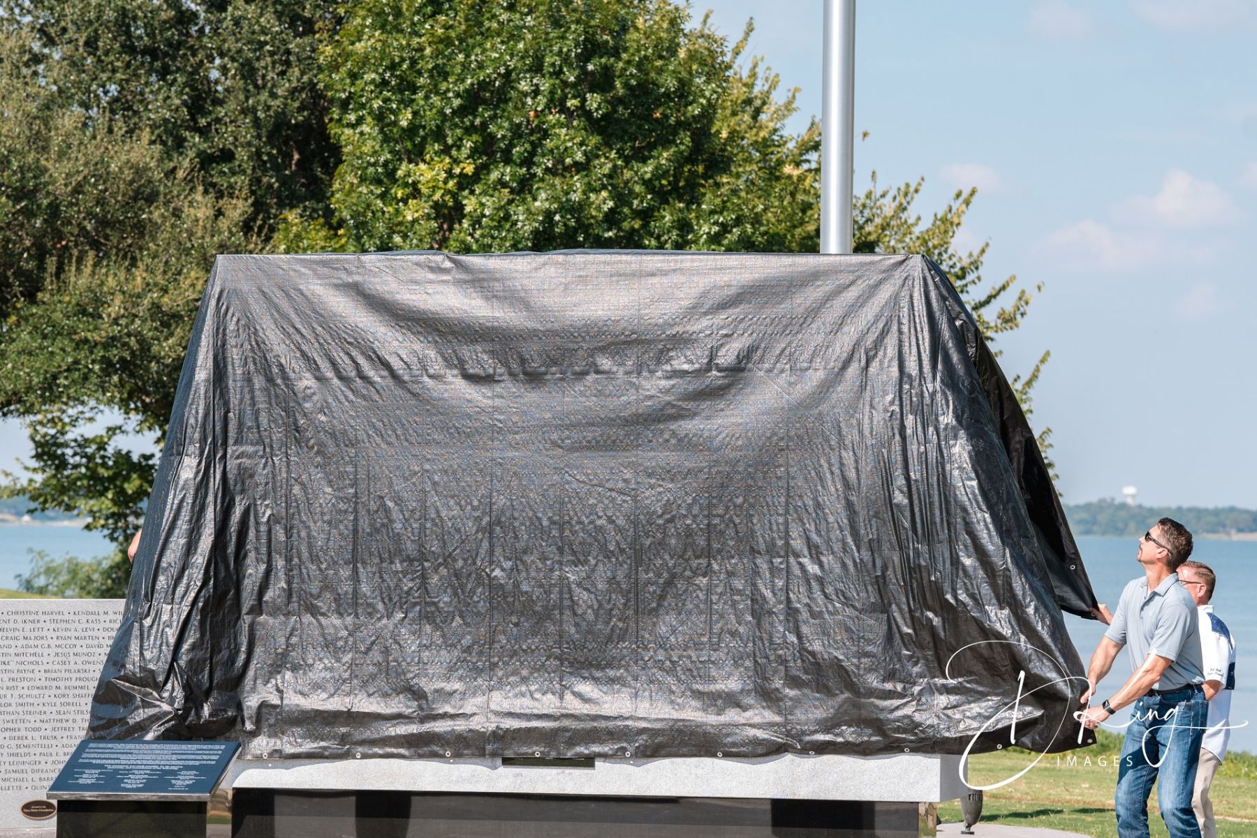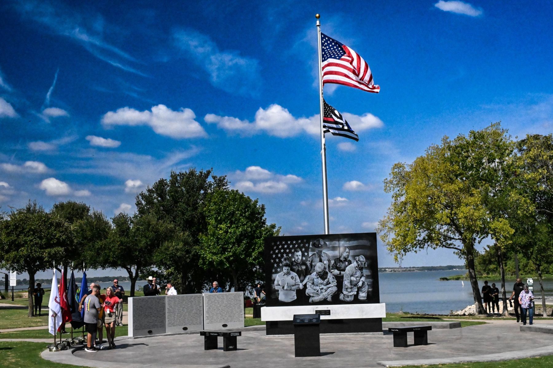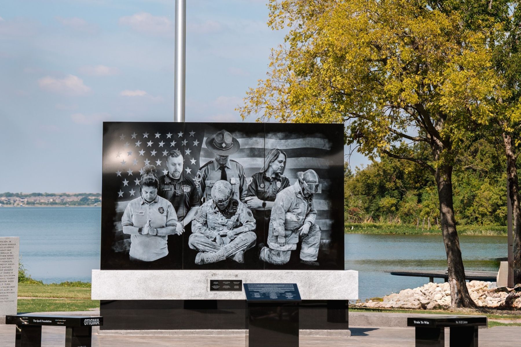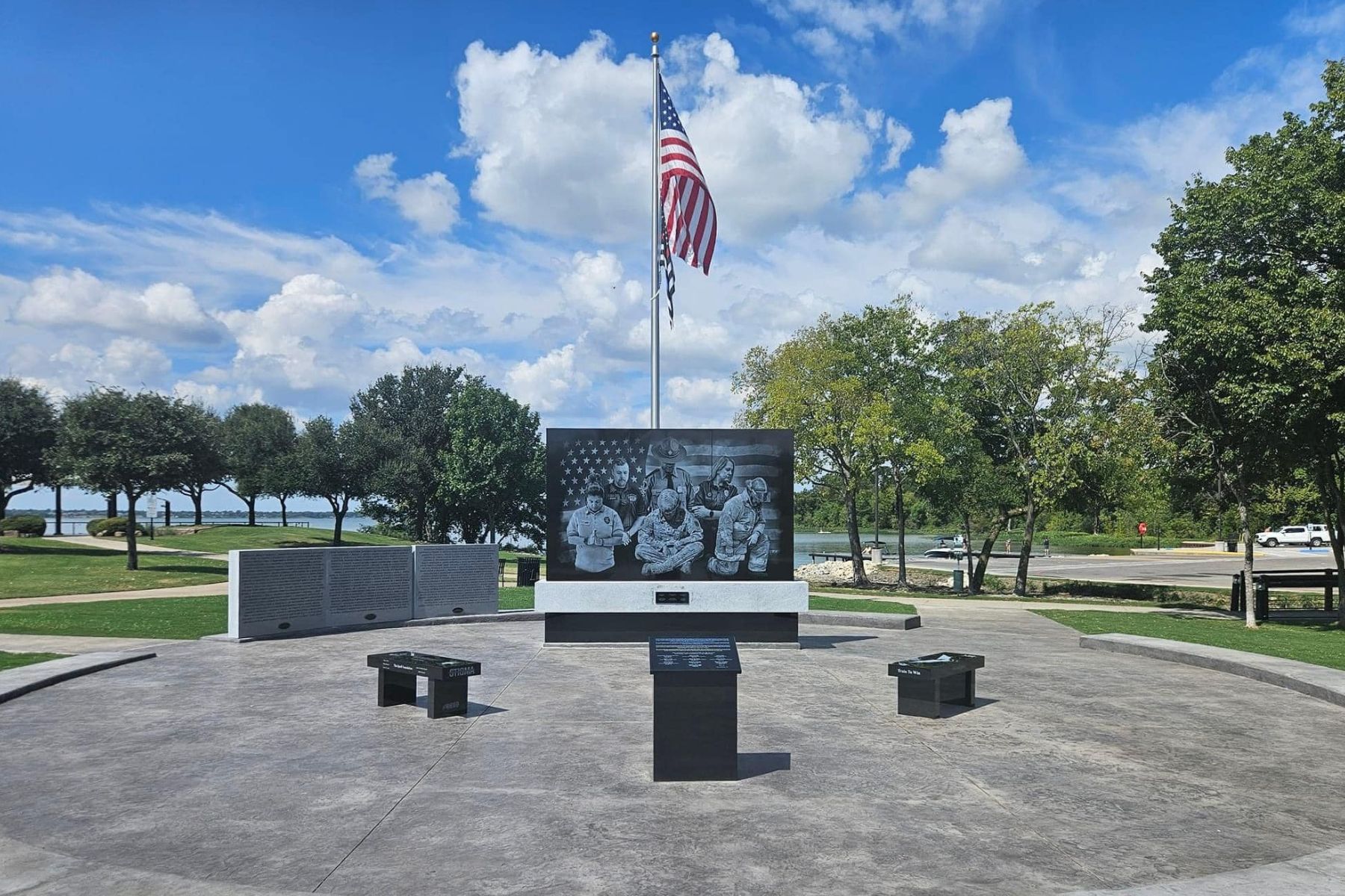 The monument is installed at Heroes Memorial Park in Rockwall, Texas on the shores of Lake Ray Hubbard.