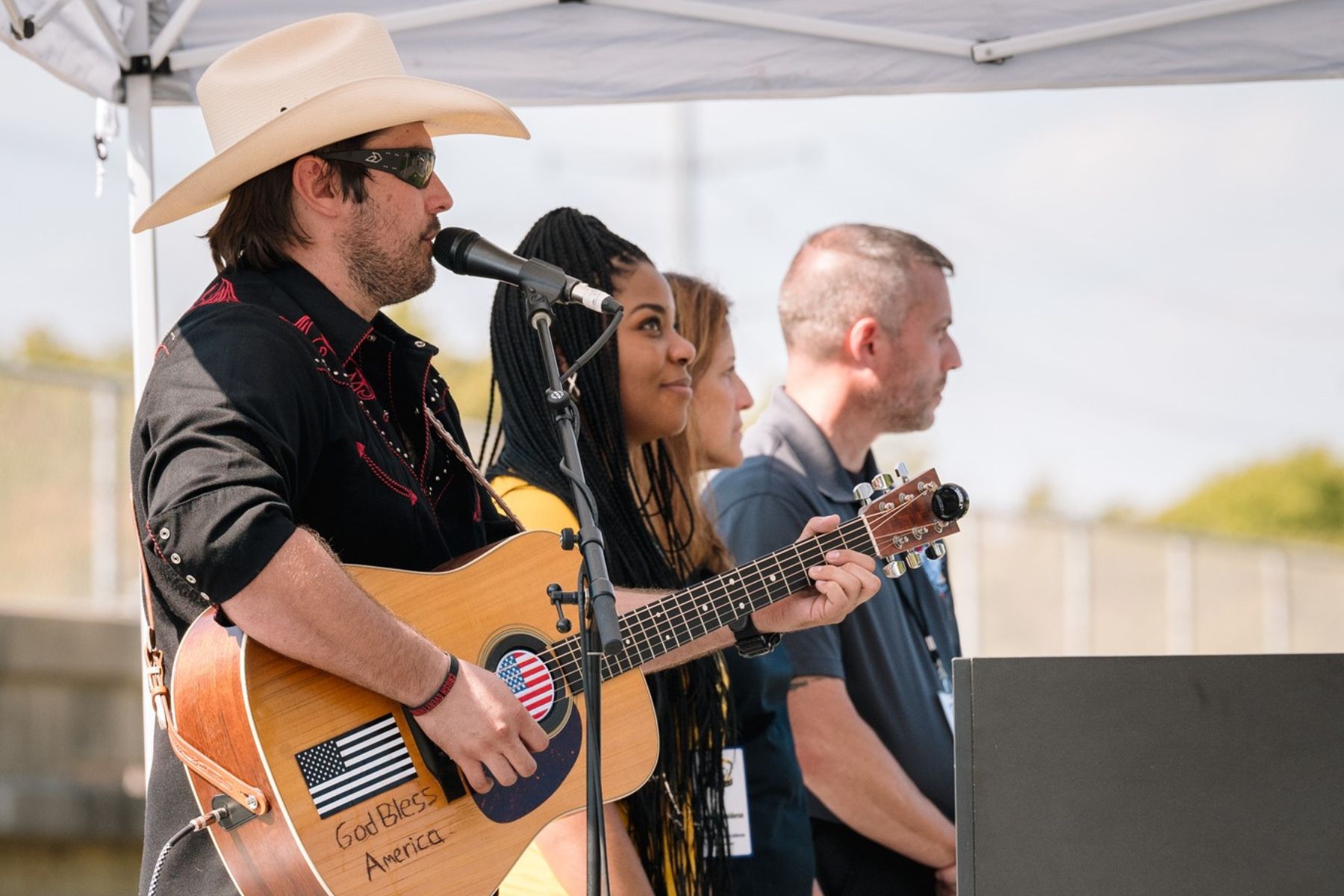 Surrounding this powerful centerpiece is the Wall of Service: 23 slanted granite blocks that will hold the engraved names of veterans and first responders who have lost their lives to suicide. This wall stands as a solemn reminder of their service and of the battles they fought — both visible and unseen.