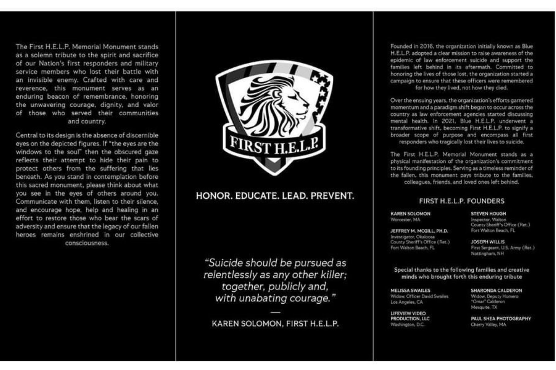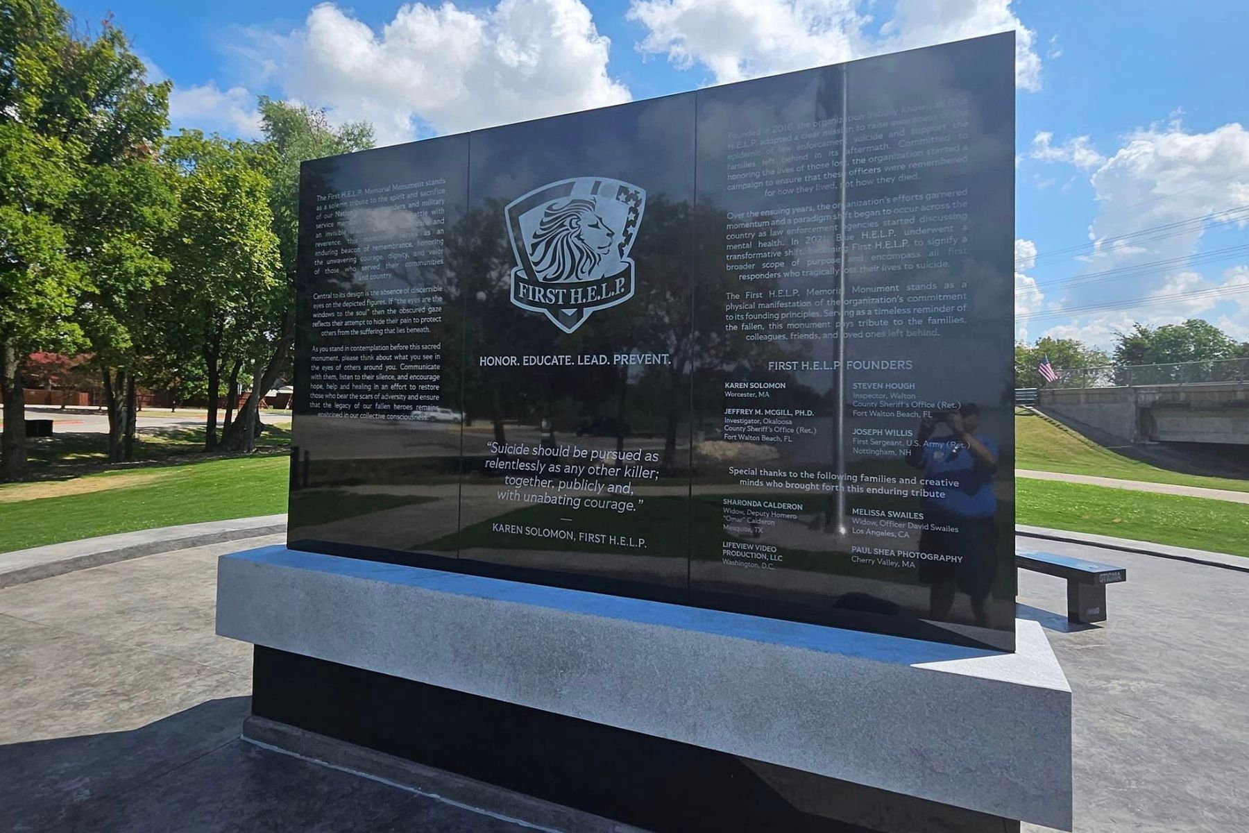 Founded in 2016 as Blue H.E.L.P. to raise awareness for law enforcement suicide, First H.E.L.P. evolved in 2021 to support all first responders. They were the first organization in the country to support all suicide families in the aftermath, collect year over year data and provide prevention programs. This monument is the gift they most wanted to give the families. A place of their own, where they can honor their loved ones with the same dignity as any other death. Without the help of our friends in Texas, this dream could not have become a reality.